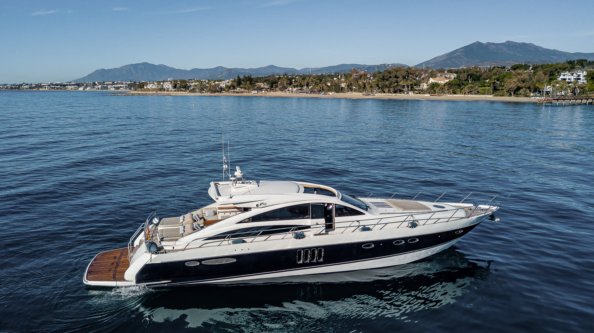 Enjoy luxury and sophistication aboard the Aim High, a stunning Princess v70 motor yacht. Traditional Princess craftsmanship, contemporary design and state-of-the-art technology combine to create an unforgettable experience. Enjoy twin sun-beds, an open-air dining area, wet bar and ample jet-ski storage. Relax in the spacious deck saloon with beautifully crafted furniture and an electrically opening hard-top. Below deck, enjoy three comfortable en-suite accommodations.